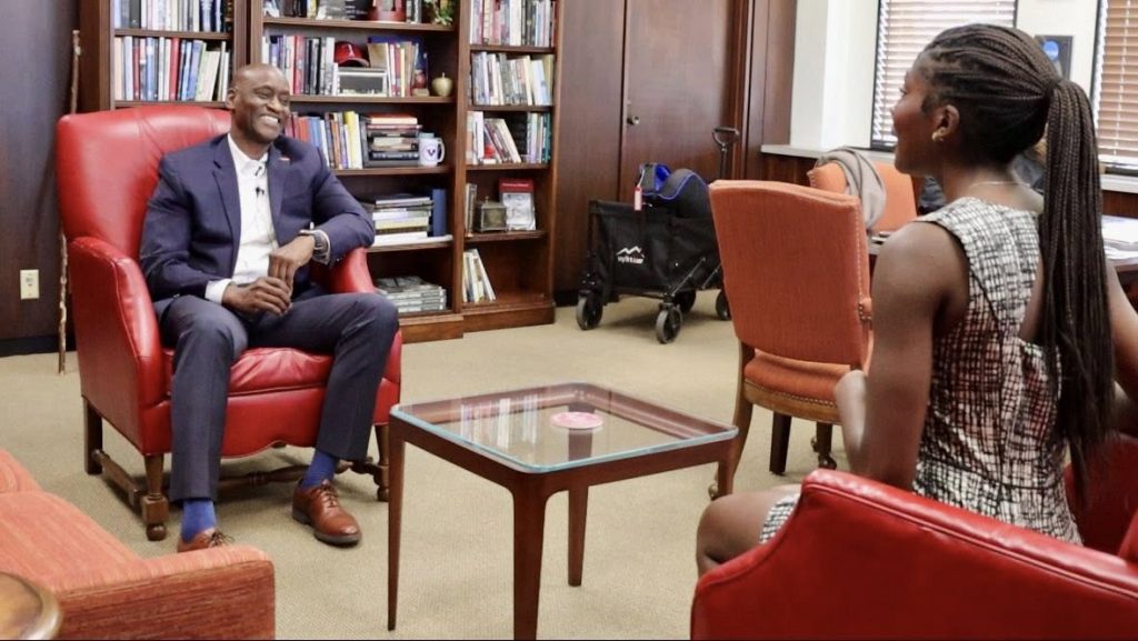 Zjeyoni Moore sitting down with Chancellor Robinson of the University of Arkansas.